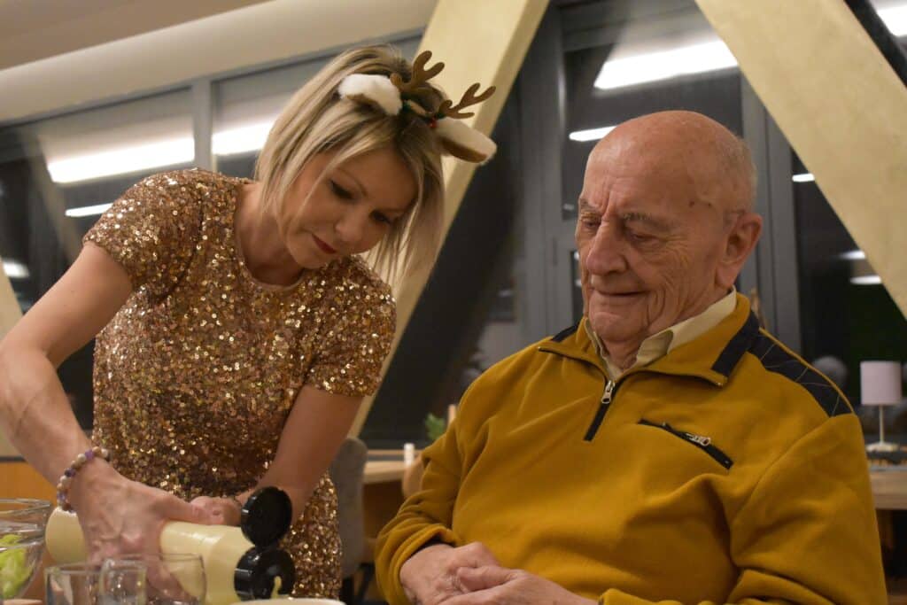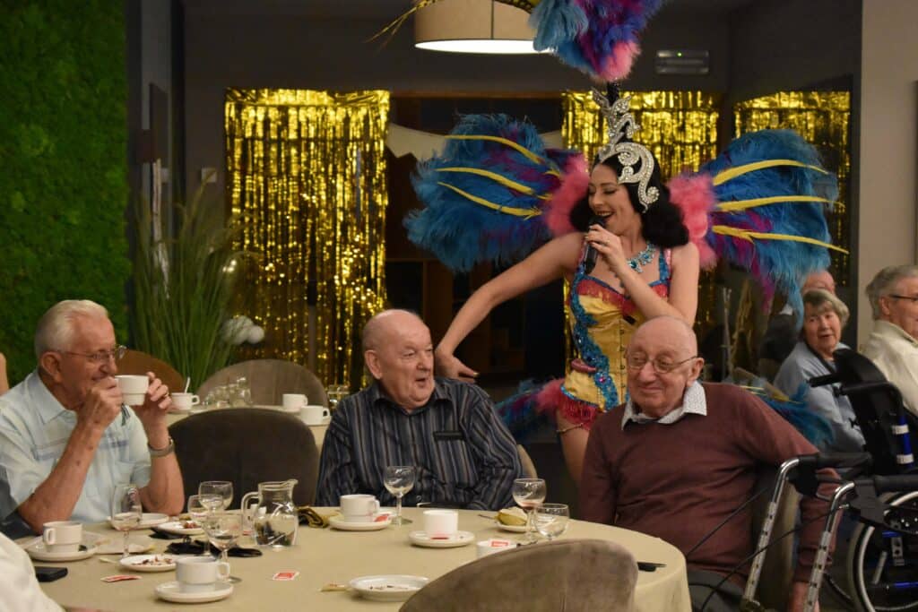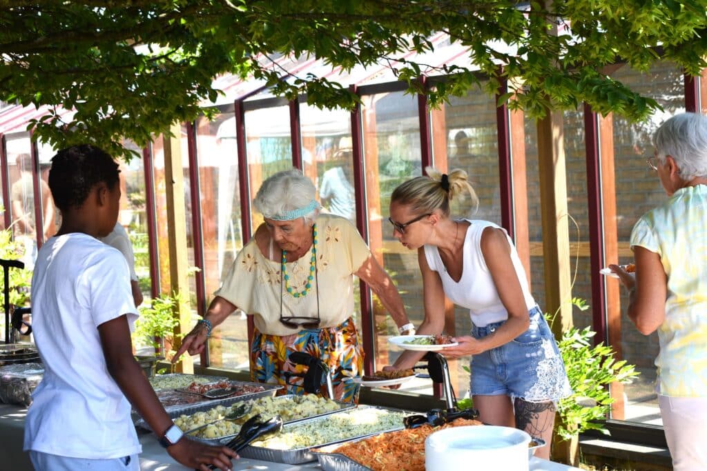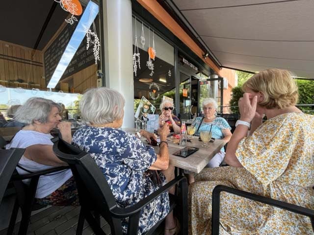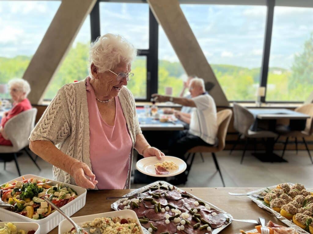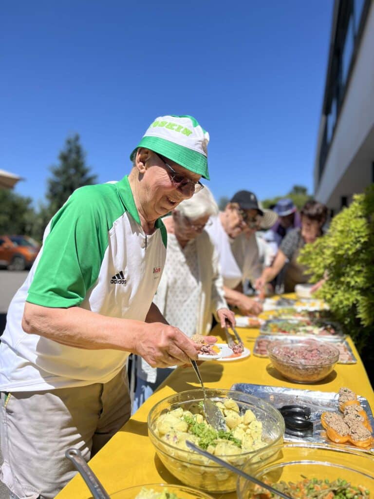 Nos résidents partagent des moments simples, remplis de bienveillance : un repas gourmand, une activité partagée, un rayon de soleil dans le parc.